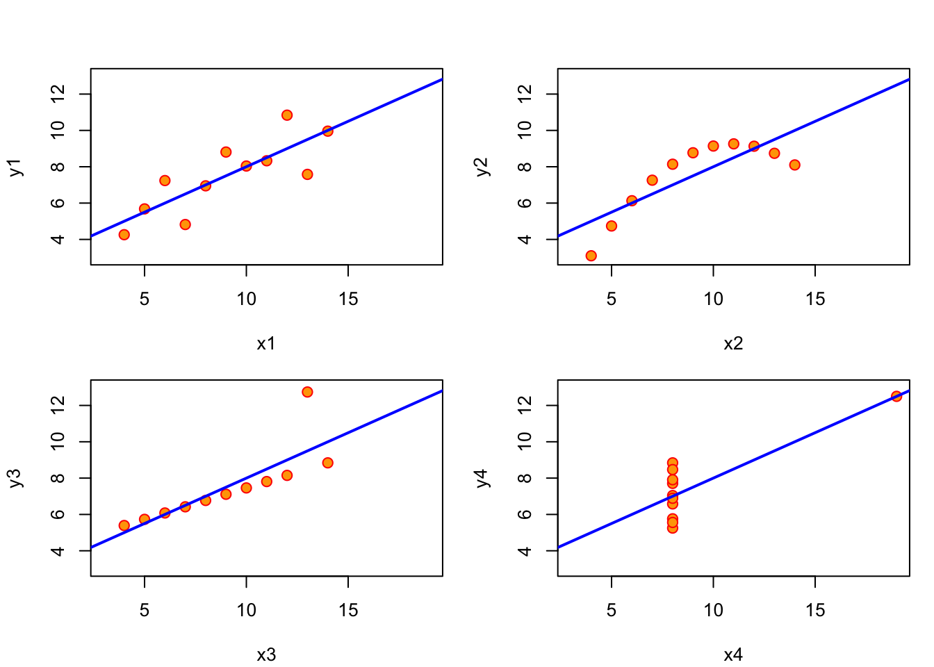 The first data set (top left) is the only one for which linear regression is appropriate, because it is a linear trend with identically distributed noise added. Each of the other three data sets are not suited for linear regression for different reasons: the second one (top right) is clearly following a nonlinear (quadratic) trend; the third one (bottom left) has a perfect linear trend with only a single point strongly deviating from it; and the last one (bottom right) has all but one point concentrated at the same x coordinate, which makes the linear regression dependent on that single point.