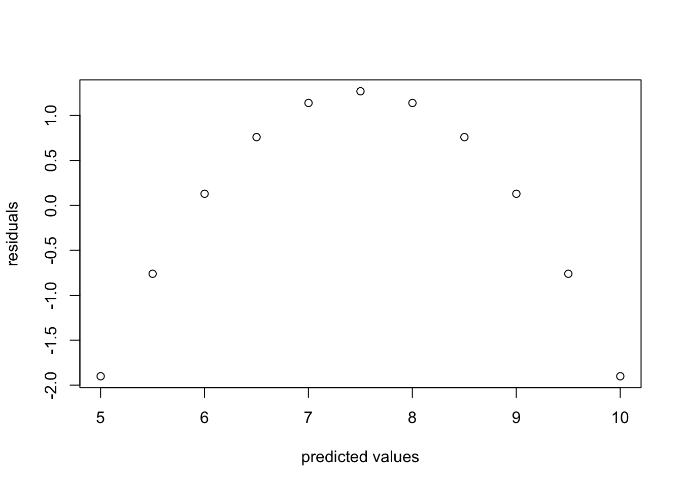 In Figure 4.5 shows a plot of heart rates as a function of body temperatures. The data set is plotted in the first panel, with best-fit line overlayed on the data. The regression has the r-squared of 0.06, indicating a weak linear relationship between the variables. The residuals are plotted in the second panel, showing the errors as a function of predicted values of heart rates. The residuals plot looks like a perfect blob, with no trend either in the mean or the spread of the residuals, and thus the assumptions of regression are not violated. Note that the strength of the linear relationship is completely separate from the analysis of residuals: a weak relationship like in this data set may have residuals perfectly compatible with linear regression, while a strong linear relationship may be computed for a data set which actually has a nonlinear trend and thus should be modeled with a different function.