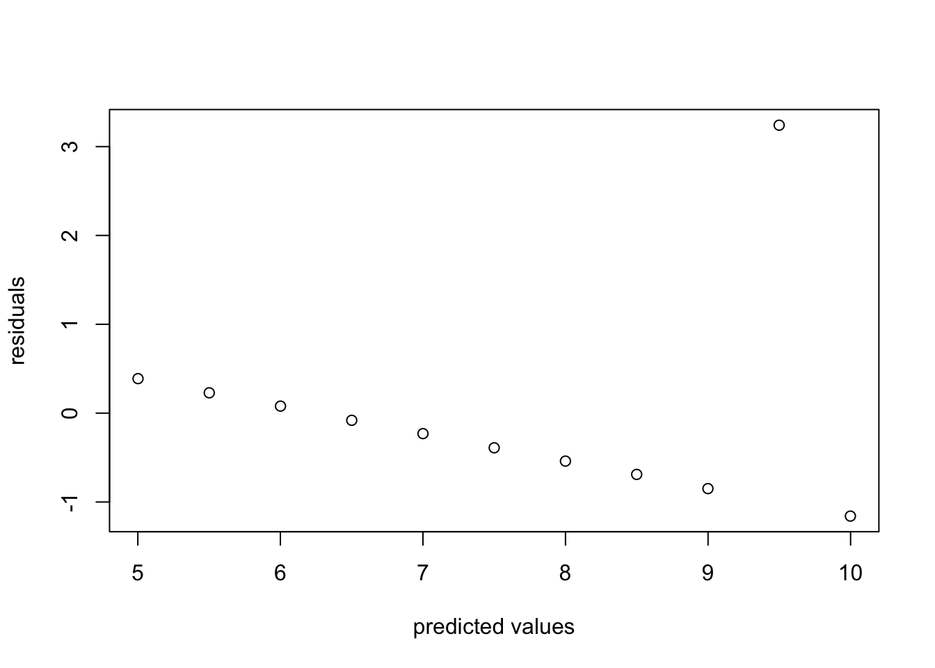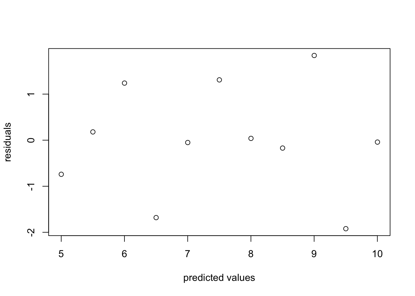 It’s essential to verify that these assumptions are not (seriously) violated for any linear regression before putting trust in its results. The most straightforward way to do so is to plot the residuals (noise), which can help detect violations of at least two of the assumptions (the first and the third). The residuals are the differences between the predicted values of the response variable and the actual value from the data. As stated above, linear regression assumes that there is a linear relationship between the two variables, plus some uncorrelated noise added to the values of the response variable. If that were true, then the plot of the residuals would look like a formless blob, with a mean value of 0 and no discernible trend (e.g. no increase of residual for larger \(x\) values). Visually assessing residual plots is an essential check on whether linear regression is a reasonable fit to the data in addition to the \(R^2\) value.