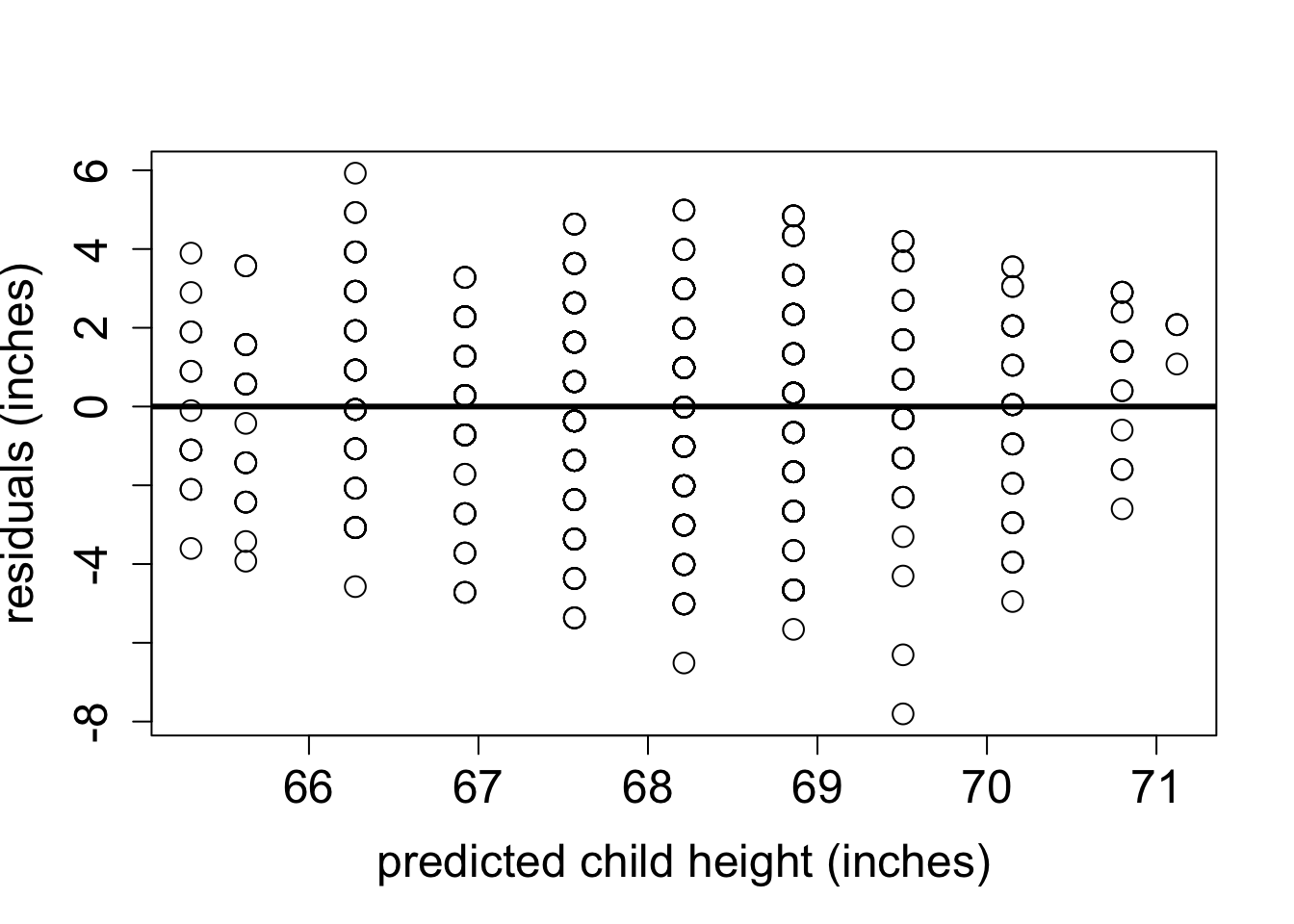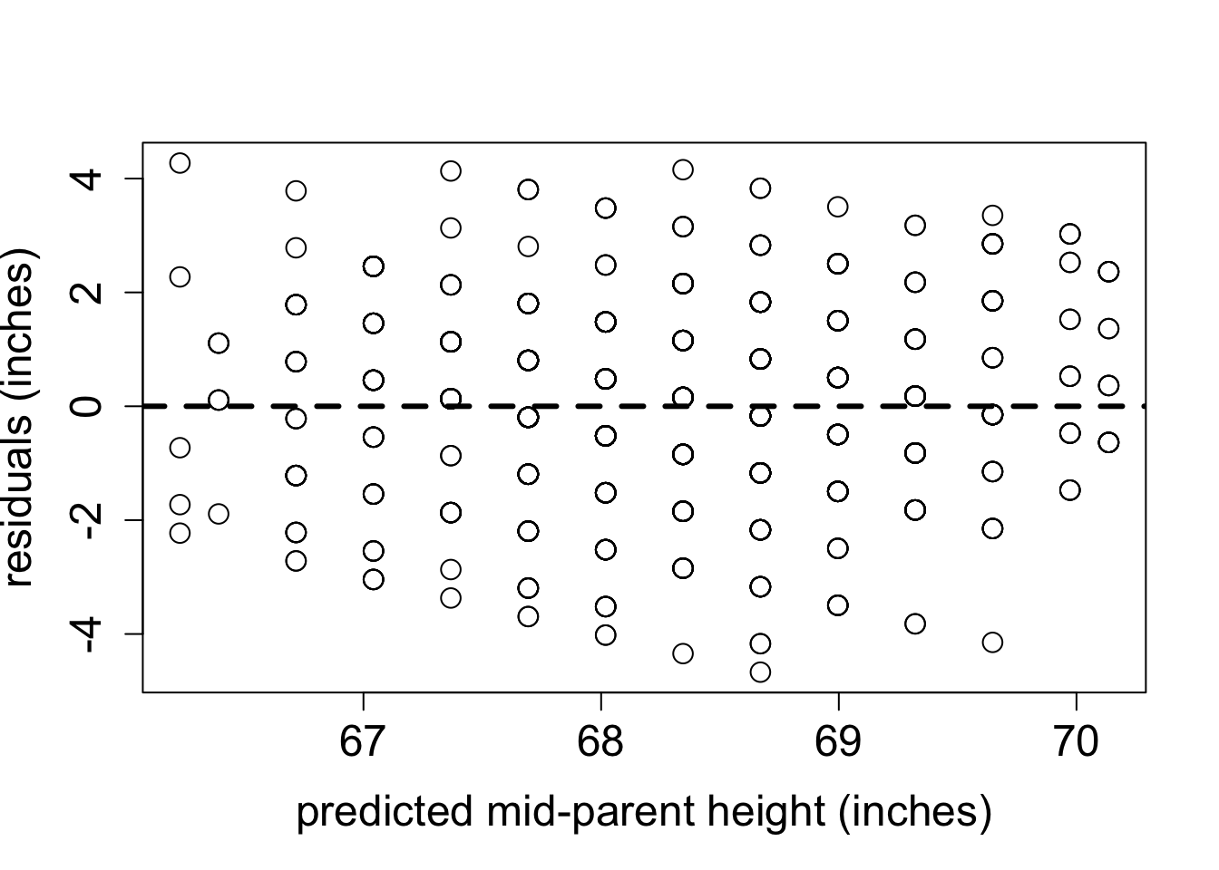 The phenomenon called regression to the mean is initially surprising. Francis Galton first discovered this by comparing the heights of parents and their offspring. He collected a classic data set of the heights of parents and their children, and examined their relationship (this was before scatter plots were used, so he looked at summary tables). It was clear that there was a positive relationship between these variables, that is, taller parents tend to have taller children, as you can see in Figure 4.7. One can make a linear regression both to predict the children’s height from the parents’, and the other way around. Figure 4.7 shows Galton’s data set along with the linear regression line and the identity like (\(y=x\)). If each child had exactly the same height as the parents, the scatter plot would lie on the identity line. Instead, the linear regression lines have slope less than 1 for both the plot with the parental heights as the explanatory variable and for the plot with the variables reversed. To make sure that linear regression is appropriate, we plot the residuals of both models in Figure 4.8. They show no trend or pattern, so we can trust that the linear relationship is reasonable.