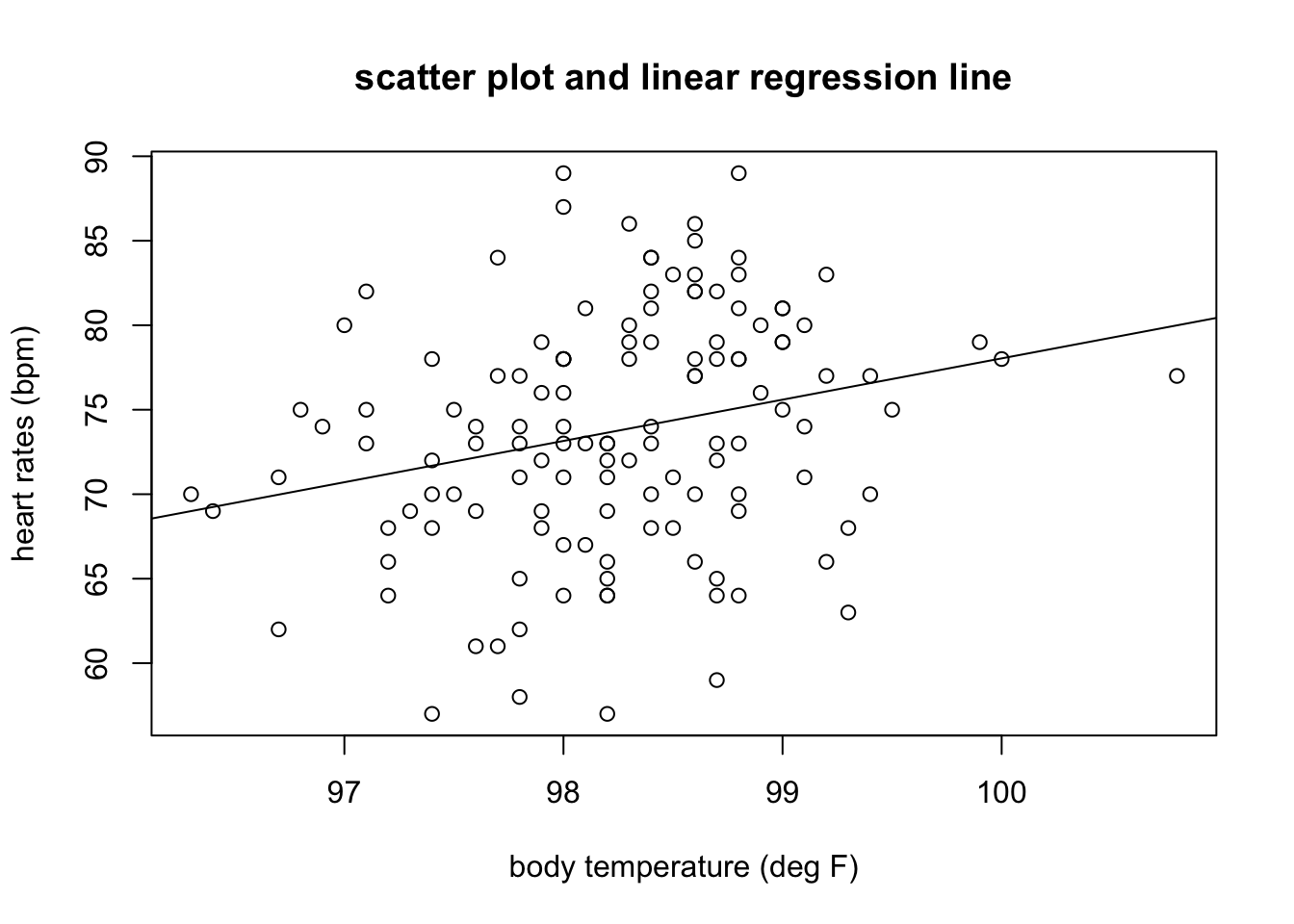 Here Temp and HR are the explanatory and response variables, respectively, and my_data is the name of the data frame they are stored in. The best fit parameters are stored in myfit, and the line can be plotted using abline(myfit). The script below shows how to calculate a linear regression line and then plot it over a scatter plot in R, and the result is shown in figure \(\ref{fig:linreg_HRTemp}\)a.