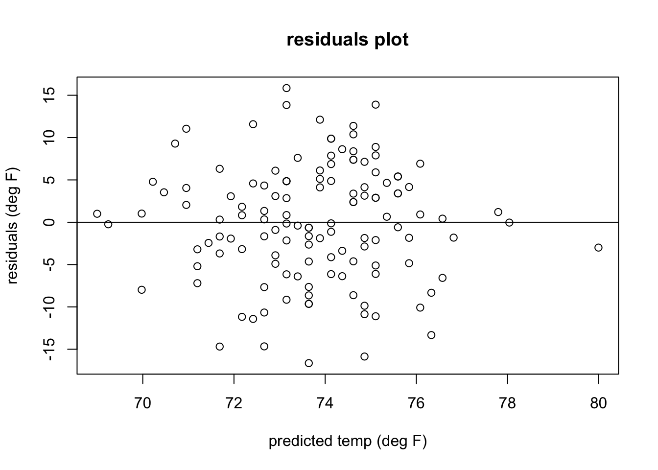 There is another important measure of the quality of linear regression: the residual plot. The residuals are the differences between the predicted values of the response variable and the actual value from the data. As stated above, linear regression assumes that there is a linear relationship between the two variables, plus some uncorrelated noise added to the values of the response variable. If that were true, then the plot of the residuals would look like a vaguely spherical blob, with a mean value of 0 and no discernible trend (e.g. no increase of residual for larger \(x\) values). Visually assessing residual plots is an essential check on whether linear regression is a reasonable fit to the data in addition to the \(r^2\) value.