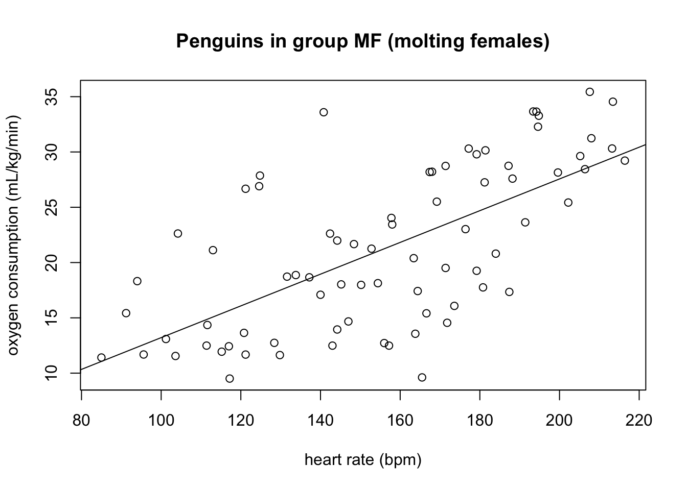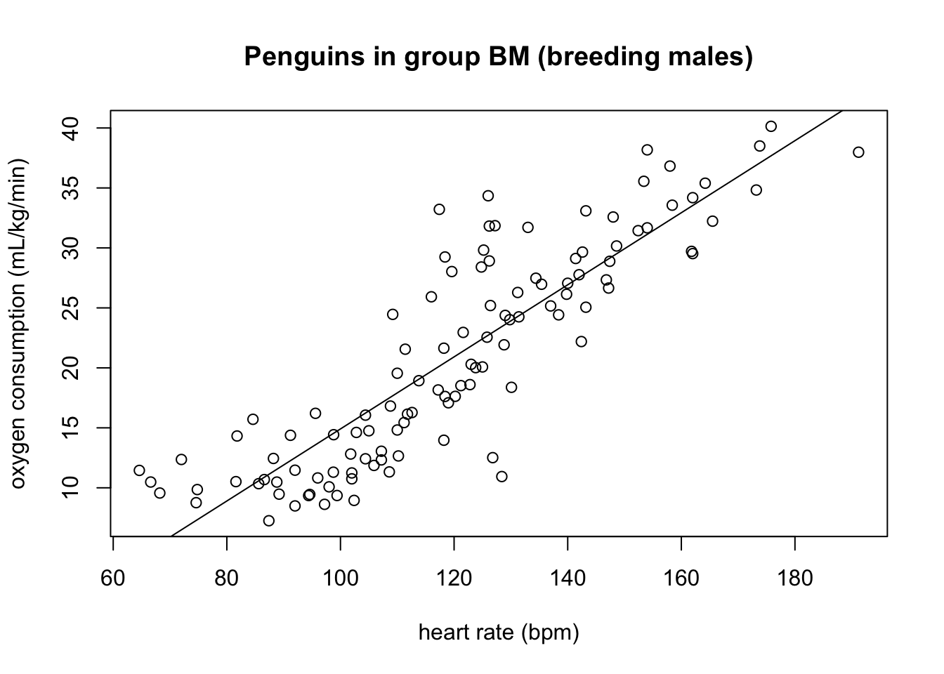 Figure 4.2 shows scatter plots of the rate of oxygen consumption (VO) and heart rate (HR) measured in macaroni penguins running on a treadmill (really).