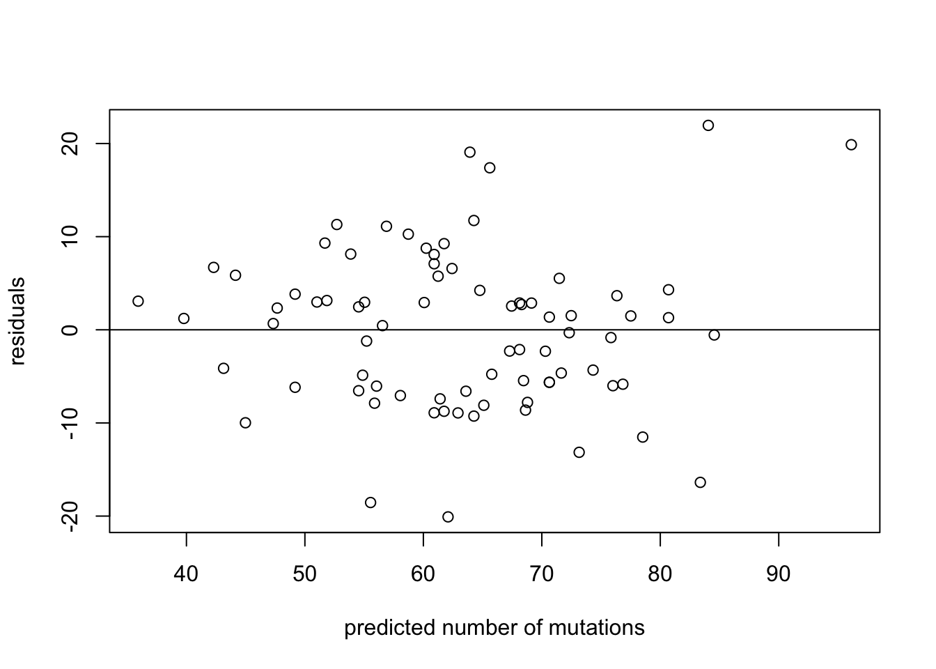 To illustrate this, we show scatter plots of data and of residuals side by side. In Figure 4.4 the data set from (Kong et al. 2012) is plotted, showing the number of de novo mutations in 73 offspring as a function of paternal age. The data set is plotted in the first panel, with best-fit line overlayed on the data. The regression has the r-squared of 0.65, indicating a strong linear relationship between the variables. The residuals are plotted in the second panel, showing the errors as a function of predicted values of mutations. Despite a couple of apparent outliers, the residuals plot shows no trend either in the mean or the spread of the residuals, and thus the assumptions of regression are not violated.